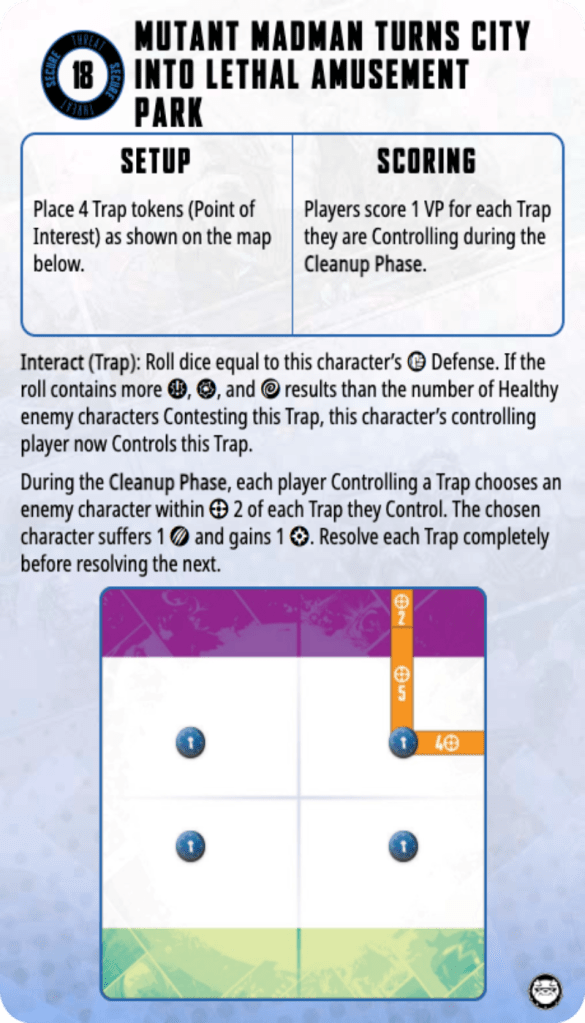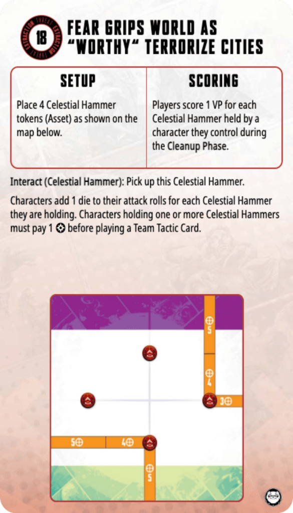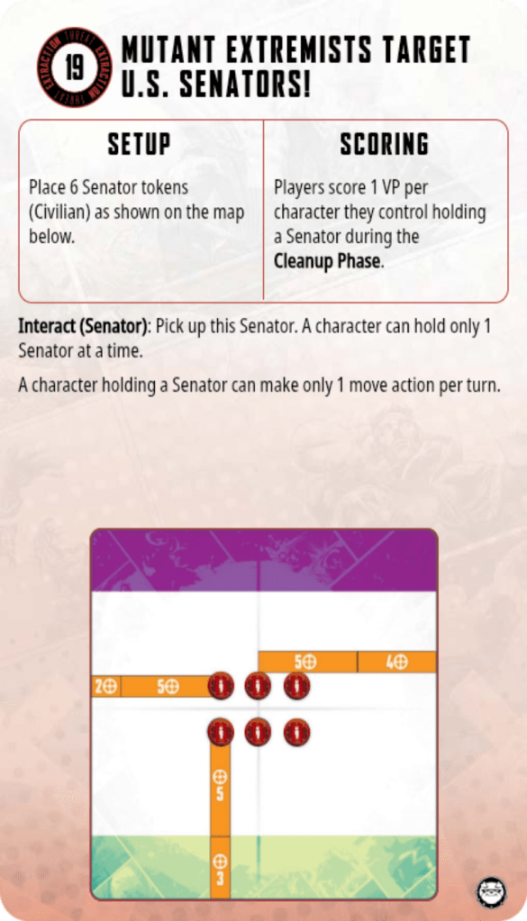 While not D-shaped, Unexpected Guests Crash Royal Wedding does place does have a wide extract placement. It also has a threat of 17. Also, a lot of the extract steal superpowers and Team Tactics Cards, such as those brought by Namor and Quicksilver, cannot steal Civilians. Since we are not bringing any such steal abilities, this is only a positive. The placement affect must be played around, however. Likely one of our extracts will be on Toad, who’d like to just sit on a secure with an extract. I’d hesitate to prioritize Apocalypse picking up one of these extracts since his positioning can be key to victory. Despite the placement affect, this is a premier extract for Servants of the Apocalypse lists.