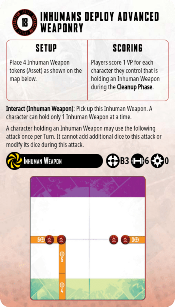 Inhumans Deploy Advanced Weaponry offers another extract that can force your opponent to split up their characters. It also can force your opponent to leave a character with an extract on the midline. The combination of Apocalypse’s 65mm base, the Range 2 place from Vanish Into Dust, and his Range 3 builder attack can allow an Apocalypse that was deployed directly in-front of a midline extract to double attack an enemy character that picked the extract up and had to stay within Range 1 of the midline. However, there are common midline extract grabbers that do not have to do this, Toad and Namor for example.