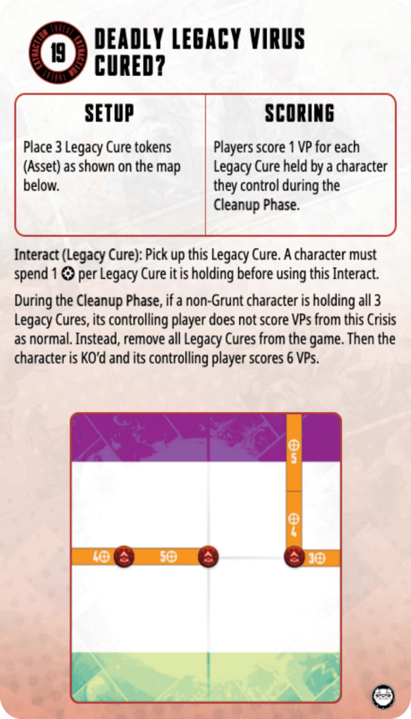 Deadly Legacy Virus Cured? is not only a thematic extract for the Servants of Apocalypse to take, but also an extract that combos well with multiple superpowers on key affiliated characters. Toad can easily grab one of the midline objectives with your first activation. He can also later take extracts off of other allied characters, giving us greater potential to get all three Legacy Cures on Toad and, thus, gaining 6 VPs. Celestial Technology can also be used to force allied characters to drop Legacy Cures, giving another way to more easily get all three extracts on a single allied character. Depending on your character selections, 19-threat may not be ideal, but it is a very playable threat for Servants of the Apocalypse.